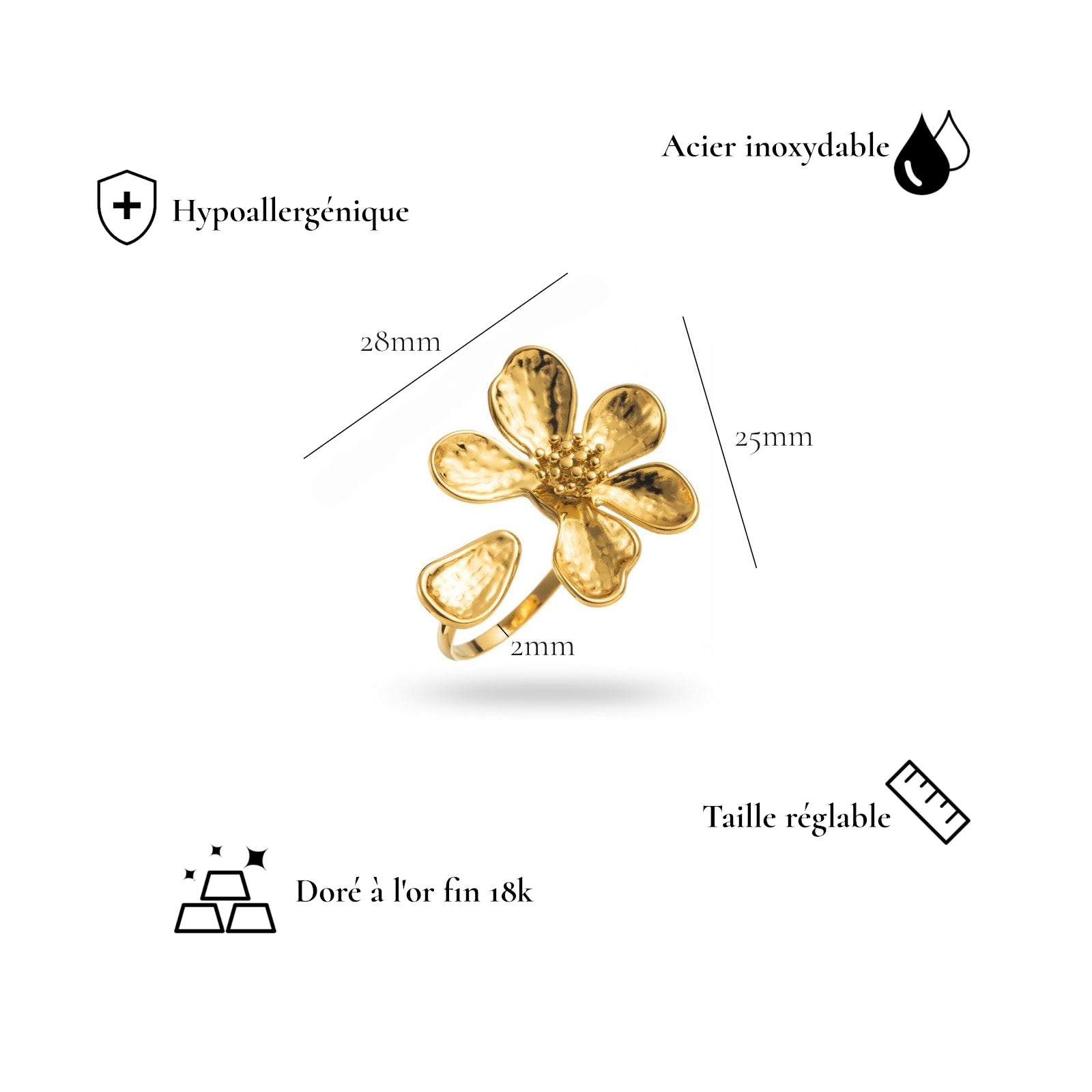 Bague représentant une fleur avec un pétale détaché - Acier inoxydable de qualité - Doré à l'or fin - Taille ajustable