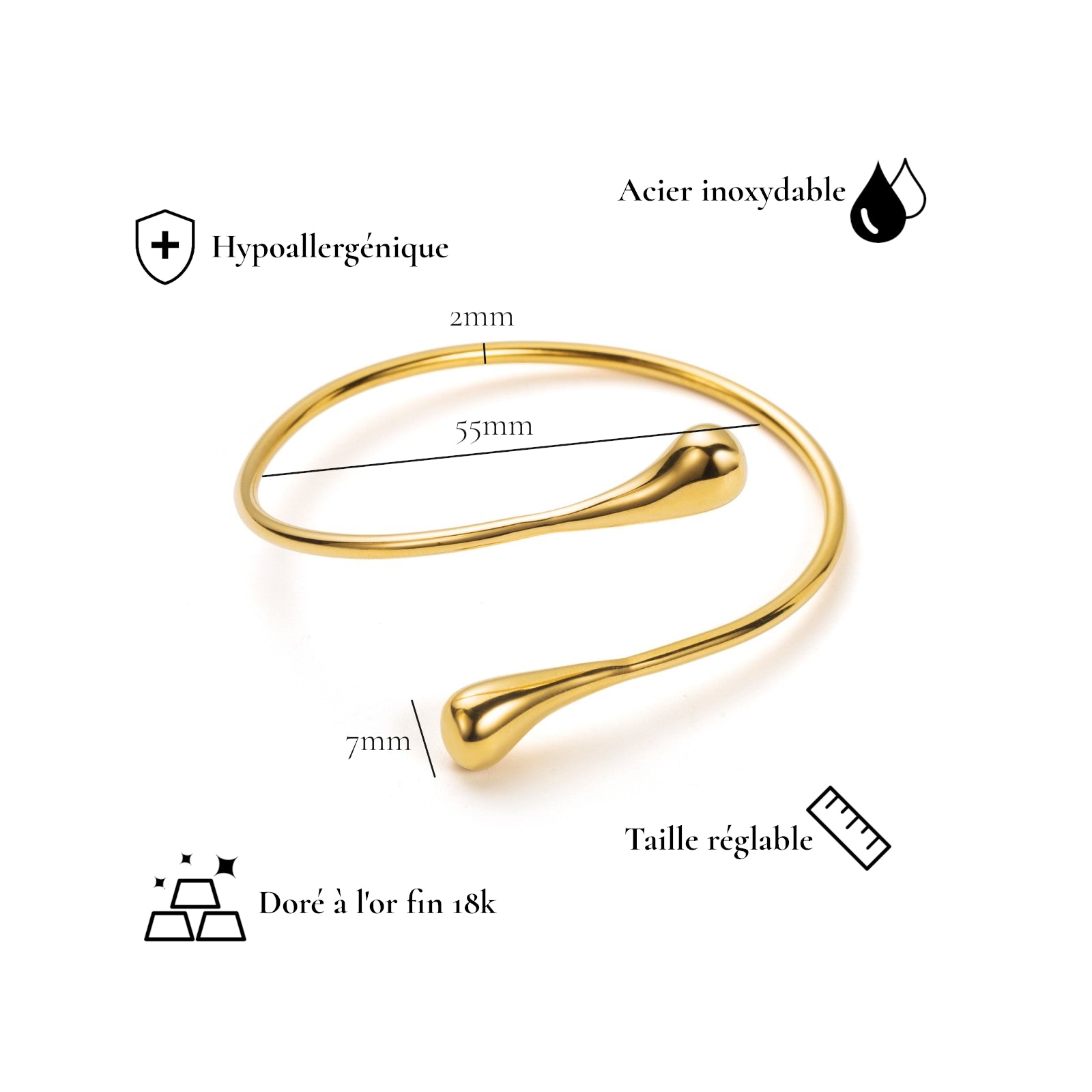 Un bracelet ouvert sans fermoir, facile à enfiler et agréable à porter toute la journée.