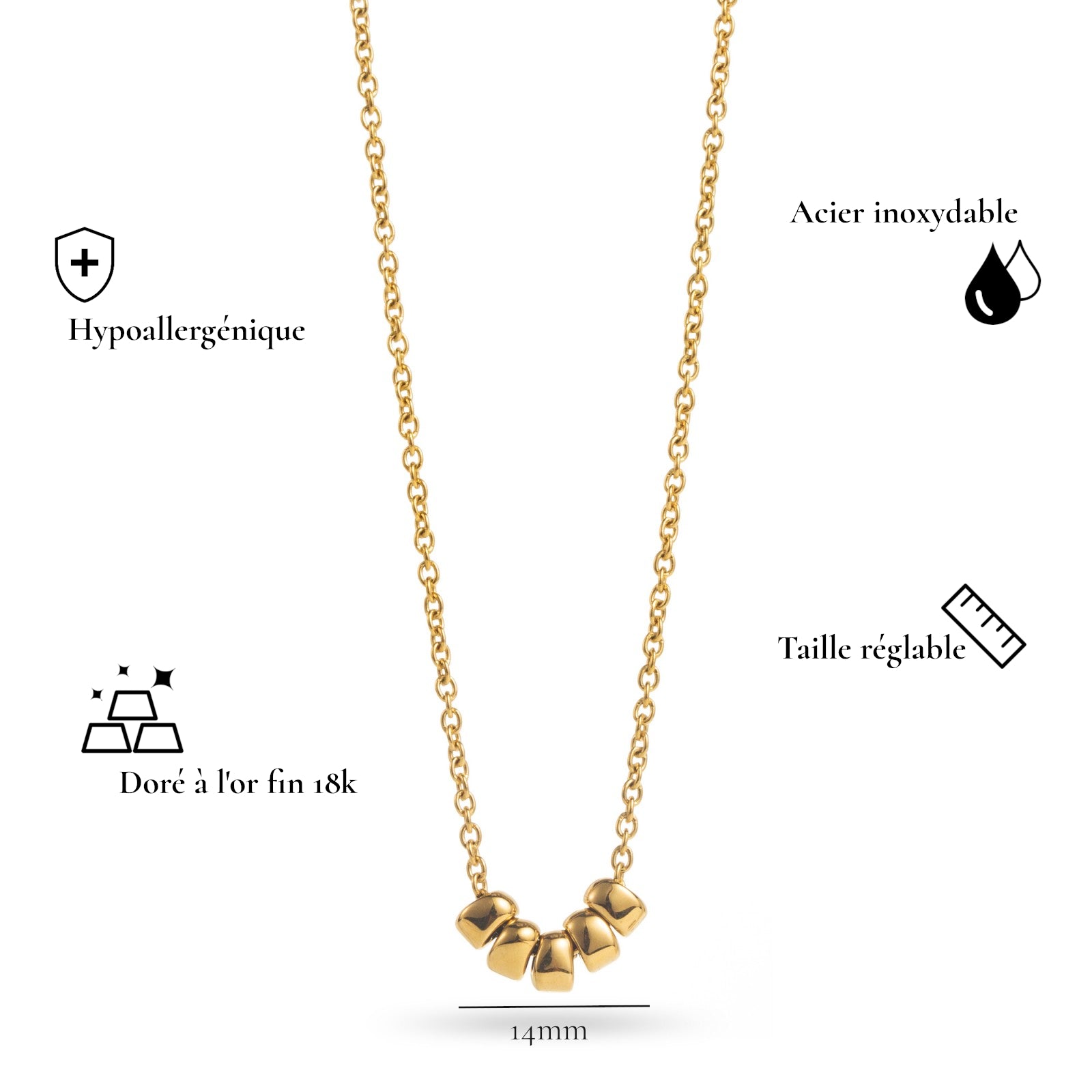 Sublimez votre style avec notre collier Eunomia, un bijou délicat et original qui associe modernité et sophistication. Sa fine chaîne en mailles classiques est ornée de cinq éléments métalliques aux formes douces et arrondies, disposés