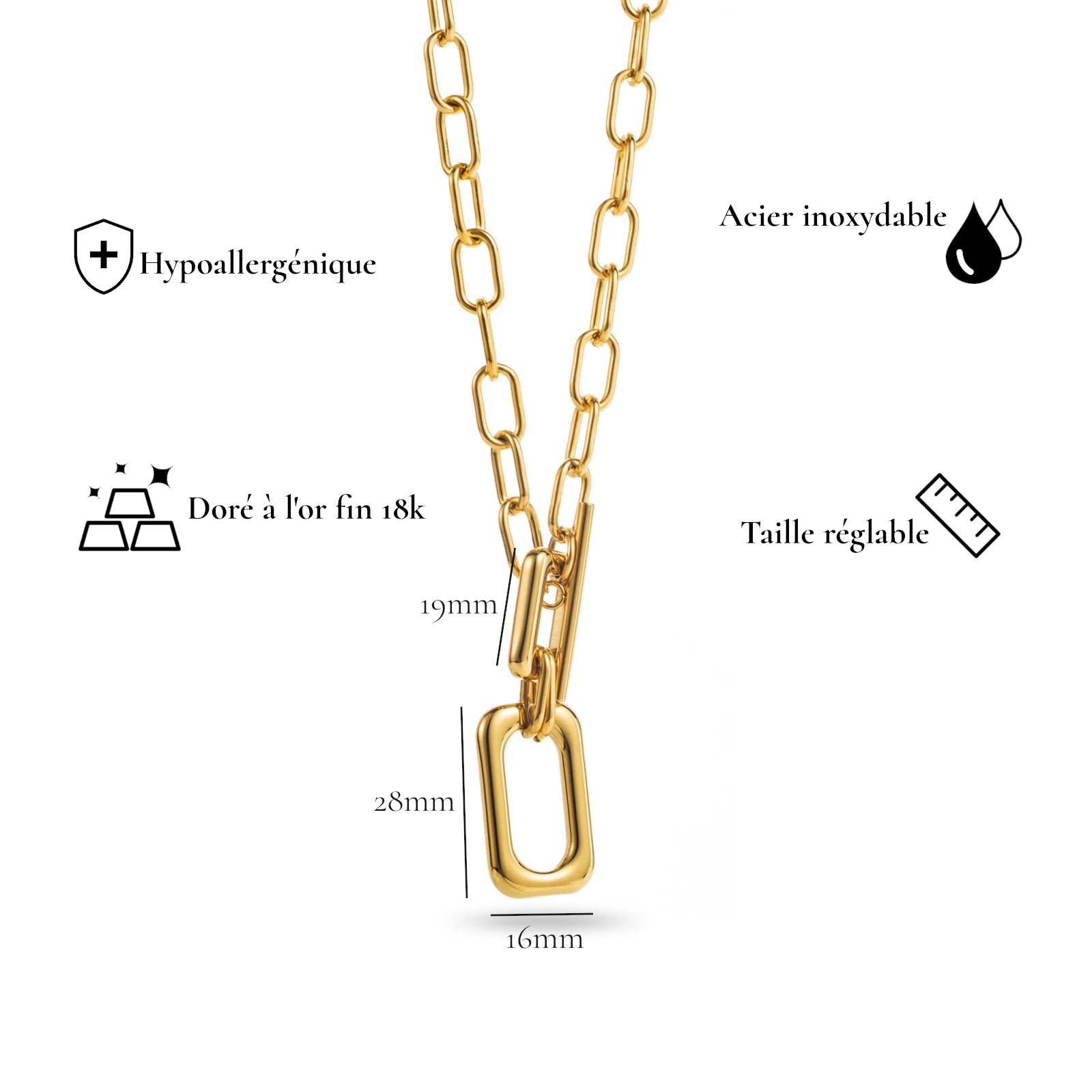 Affirmez votre style avec notre collier Erytha, un bijou au design audacieux et contemporain. Composé d’une chaîne aux larges mailles ovales et d’un pendentif rectangulaire lisse et brillant, ce collier en finition or ou argent incarne l’équilibre parfait entre robustesse et raffinement.
